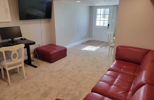 Urbana, MD close to Frederick. 1 bedroom basement apartment with own private entrance. No granted access to unit above or vice versa. Very large over 1200 sq ft that features a separate living room / dining room. Fully remodeled kitchen and bath. 55 in TV with strong wifi and separate work area. Laundry room and separate bedroom with queen bed.
