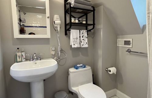This cozy third-floor suite, ideal for a family of four (max two adults), offers hotel-style comfort with two rooms: one with a queen bed and a second with a queen air mattress. You’ll enjoy a private bathroom, microwave, K-cup coffee maker with essentials, and a mini fridge stocked with bottled water.