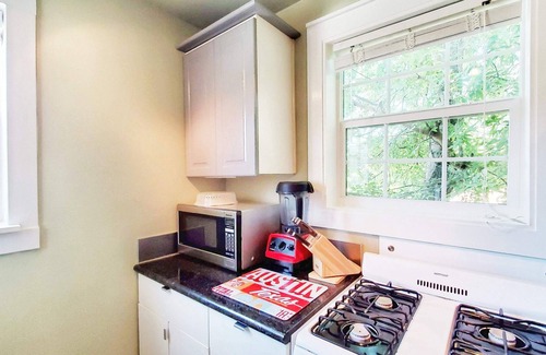 Our 1930s guesthouse was remodeled extensively to meet modern life style. No off-gassing from new building materials, no germy carpets, Safe and Eco-Friendly. The guest house is located in the heart of Austin Texas.
