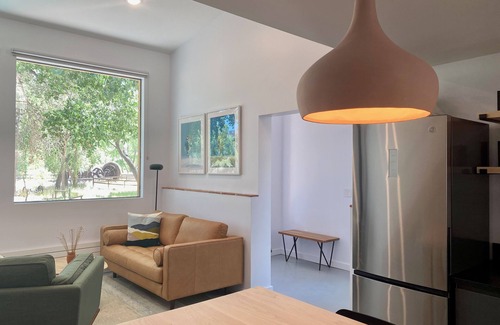 Stay on the flank of Sleeping Ute Mountain in historic McElmo Canyon just 40 minutes from Mesa Verde and 20 minutes from the town of Cortez. The Workshop Loft is a new build completed in the Summer of 2021. A converted former barn workshop, the Loft sits below red rock cliffs with high-end amenities, great internet, a private patio, and gorgeous river-bottom cottonwood views. A perfect place to base yourself for your next creative endeavor or for exploring in the wilds of the Four Corners.