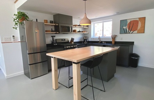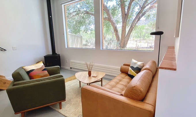 The Workshop Loft is a converted cabin workshop that fills the west side of a large barn in the creek bottoms on the banks of McElmo. Completed in the Summer of 2021, the Loft boasts high-end, comfortable appliances, a full, well-equipped kitchen, two bathrooms and a large, luxurious shower, washer and dryer, high-speed internet, a comfortable bed, and midcentury-southwest inspired aesthetic. The barn sits down a hill under the shade of a large tree, but has impressive red rock views out the bedroom and back of the house. In addition to the comfortable living space, the Loft has a small private patio with a barbecue, an outdoor dining table, and solar string lights. Just up the hill from the loft, in a red rock alcove, is a little lawn with even more magnificent views.