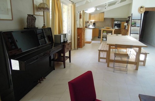 All the rooms in the house open outwards. The living room has a large table that can accommodate 10 guests, a fireplace and a piano. We leave at the disposal of the tenant: books, DVD and games.