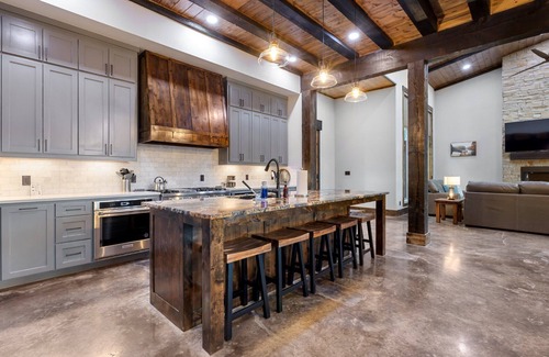 Beautiful concrete floors stretch out as far as the eye can see across the open-concept living room. The soaring ceilings, rustic beams, and incredible views, cultivate a sense of space and wonder from the moment you step inside. Relax on the cozy couch in front of the gas fireplace, enjoy your favorite shows on the smart TV, or simply soak in the awesome views.
