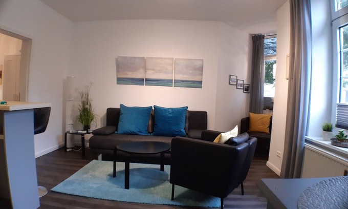 Our small, cozy apartment can accommodate 2 people and is located on the ground floor of a historic apartment building in the center of Bredstedt that was renovated in 2017. The combined living / dining area with sofa bed is followed by the bedroom with double bed (140x200). Both rooms with TV and equipped kitchen. In the annex there is a washing machine and dryer for free use. Quiet but central location, 300m to the center with shops and restaurants.
