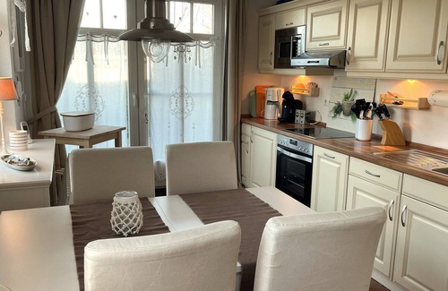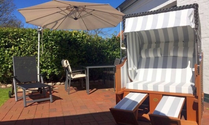 The original Frisian house from 1923 was extensively renovated in 2007 and 2011. Here you can feel completely comfortable and unwind to your heart's content - amidst well-kept nature with Friesenwällen, water lily pond, playground and meadows, only 500 meters from the sea. The tastefully and lovingly furnished bright Non smoking apartment consists of 2 bedrooms, a living room with modern kitchen, dining area and shower room. The apartment was completely renovated and furnished in late 2016. You will find a good equipment (W-Lan, telephone, Bluetooth CD mini system, Internet radio, 3 TVs (including 1x SAT), 2 DVD players, Tassimo + normal coffee maker, microwave, hair dryer, good kitchen utensils / glasses, small library). In the complex there is a private laundry with washing machines and dryers for a small fee. With a size of about 61 square meters + 2 large terraces, both parts of the garden completely completed, it is ideal for small four-legged friends.