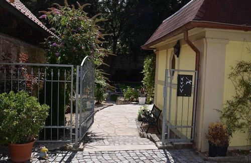 If you want to sit back after a city walk, enjoy peace and relax, you should definitely visit one of the beautiful places in the garden. The holiday idyll reveals itself from another sunny side: Here colorful flowers and shrubs thrive, as a small brook ripples, where an ancient beech (illuminated at night) tells stories from bygone times. The garden fence itself consists of a section of the historic city wall Mühlhausen. There are comfortable sun loungers for sunbathing and reading, a covered arbor and a gazebo with kitchen, if it should raise a small rain shower.