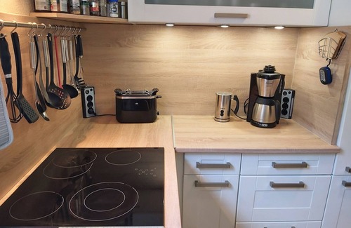 In the fully equipped kitchen you will find a ceramic hob, oven, refrigerator, dishwasher, microwave, coffee maker, toaster and kettle