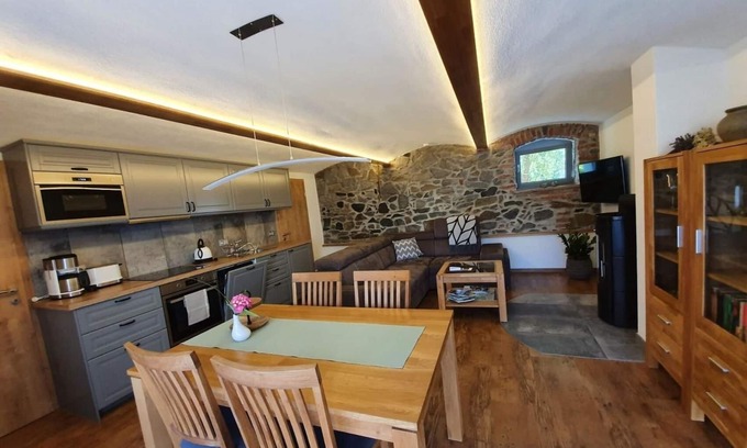 The apartment is furnished on about 65 square meters living space with a spacious living room with kitchenette 2 bedrooms a large bathroom with sauna and separate toilet for up to 6 people in the EC. The apartment is located in a beautiful quiet and sunny location on a 3 Seitenhof on the Spreeaue between Bautzen and Malschwitz.