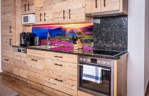 The large, fully equipped kitchen has a fridge with integrated freezer, microwave, fully automatic coffee machine, kettle, dishwasher, ceramic hob with extractor hood, oven, egg cooker, plenty of dishes, dish towels and underfloor heating.