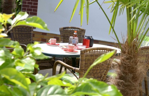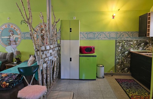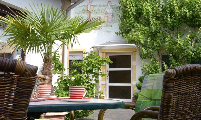 New since 2018 our "Bed & Bike Nature" room on 30m² for two persons. Not only the old stove and the beautiful wall painting in the style "Mucha" offer a special accommodation. Here romance also plays a role with a generously freestanding bathtub. Coffee and tea can be prepared, and breakfast is available just a few meters from the bakery. A beautiful courtyard with Sitzgelegeheit also invites you to relax after an eventful day. Bicycles can be accommodated on the secured property. Cars park in public space or, if available, on another secure property.