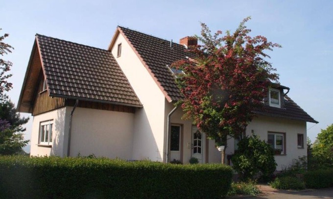 Our all-year bookable 96sqm apartment can accommodate up to 4 people. It has a large bedroom with double bed and a clock radio, and a bedroom with 2 single beds. A small cot we will gladly provide if needed. The living / dining area is equipped with an LCD flat screen TV, Sky enabled SAT receiver, DVD player, stereo system and a laptop with Wi-Fi. A high chair is provided if needed, in addition is an extensive selection of books, magazines, games and DVDs available. The kitchen is fully equipped. From a cooker with ceramic hob and oven, extractor hood, a dishwasher through a refrigerator / freezer, a microwave and a kettle and coffee machine and toaster is all there. The bathroom has a shower and bathtub, further, it is equipped with toiletries, hairdryer and makeup mirror. Our guests have a large garden with terrace and sunbathing area. Garden furniture, deckchairs, sandpit and a barbecue. The parking lot is located directly at the house, a lockable storage room for bicycles is available, Nordic walking poles are provided. An information folder, information material, brochures and hiking maps for a relaxed and detailed excursion planning are available. On request, our bread delivery service provides you with fresh baked goods every morning for a good start to the day.