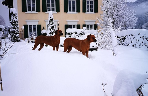 with our 3 Rhodesian Ridgebacks in the 1. Floor. Dogs, cats and infants (danger because of our pond) are not allowed.