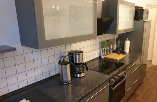 Sie verfügt über eine große, voll ausgestattete Küche, einem Schlafzimmer für 3 Personen, einem Wohnzimmer (wahlweise als Schlafzimmer mit Wohnlandschaft zum Ausziehen für 2 Personen). Ein geräumiges Badezimmer mit zusätzlicher Regendusche ist ebenfalls Bestandteil dieser schönen Wohnung.
