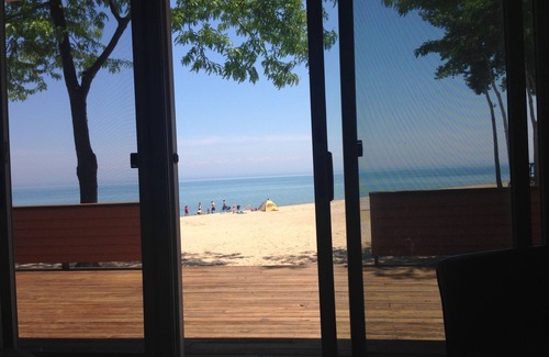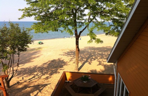 Beautiful beach house with stunning panoramic view of Lake Huron . Living room with cathedral ceiling and a fireplace. Dining room with large table. Kitchen is well outfitted with stainless steel appliances. Dishes, silverware, pots, pans and more. Propane grill outside. Washer/dryer on main floor. One bedroom on main floor with a queen bed. Full bath on main floor. Second floor balcony overlooking first floor. Master bedroom with queen bed has a balcony with lake view. The other bedroom has two sets of bunk beds(4 children). The two bedrooms share a full bathroom.