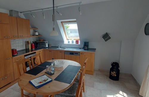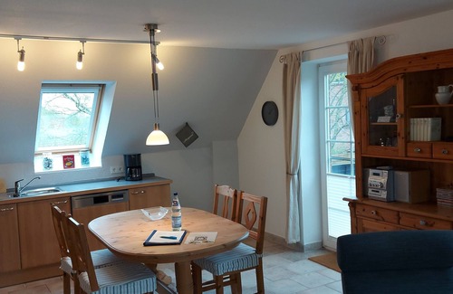 In the cozy Friesendorf Risum-Lindholm, we offer you an apartment for 2 people. The 62 m2 attic apartment is located in the Klockries district, with its many thatched frieze houses. Here you still speak Frisian, Low German and also Danish.