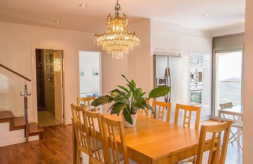 5-room house 190 m2 on 2 levels. Practical and modern furnishings: living/dining room with open-hearth fireplace, TV and digital TV (flat screen). Exit to the terrace. 1 room with 2 beds (90 cm, length 190 cm). Kitchen (oven, dishwasher, 3 ceramic glass hob hotplates, toaster, kettle, microwave, freezer, electric coffee machine). Exit to the terrace. Shower/WC. Oil heating. Upper floor: 1 room with 1 french bed (150 cm, length 190 cm), bath/WC. 2 rooms, each room with 1 french bed (135 cm, length 190 cm). Exit to the terrace. Shower/WC. Parquet floors. Patio. Terrace furniture, barbecue, deck chairs, covered balcony. Very beautiful view of the sea and the mountains. Facilities: washing machine, iron, children's high chair, baby cot for up to 2 year olds. Internet (WiFi, free). Please note: non-smoking house. TV only ES. HUTG-019349 ESFCTU00001701700031160900000000000000000HUTG-0193491
