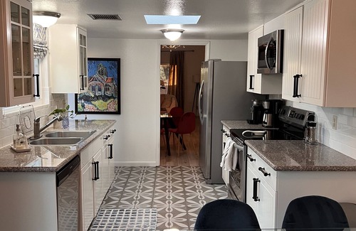 This vacation home in the foothills secluded in the mountains, nature all around, 3 bedroom, 2 baths. Newly renovated 2019 from previous 3 years ago last renovations updated linens and towels yearly nov 2022. It’s fully furnished, linen, cooking equipment and all. Bring your suitcase, this is all you will need. Golfing, hiking, shopping, galleries, dining and gourmet grocery store (AJ's) all within walking distance. This vacation property was renovated 3 years ago and this 2019 spring for a freshened up design. 2 patios, 2 enclosed court yard front and back. Private enclosed 2 car garage. Eat-in kitchenette, dining room area, large living room with wall to wall windows and Doors all new 2019. Master bedroom has a private bathroom, patio door to the back, custom barn doors for main bedroom door and closet. No carpet, all new Italian floorings throughout. New roof 2018, New HVAC (heating and cooling) 2018. This townhome is a single story, no stairs.
