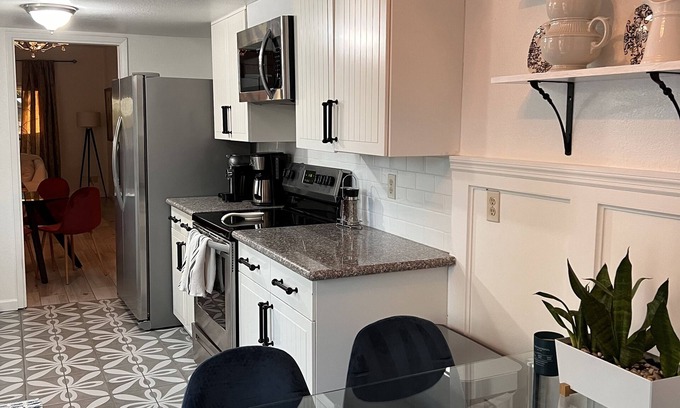 Newer appliances: refrigerator, stove, dishwasher, microwave: Stainless steel..