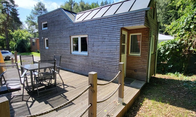 "Tinyhaus 41 Lütt Huus", 1-room mobile home. Object suitable for 2 adults + 1 child. Modern and tasteful furnishings: open living/sleeping room with 1 double bed (180 cm, length 200 cm). Open kitchen (oven, 2 ceramic glass hob hotplates, kettle). Shower/WC. Electric heating. Terrace 15 m2. Terrace furniture. Facilities: hair dryer. Extra. Parking (1 car).