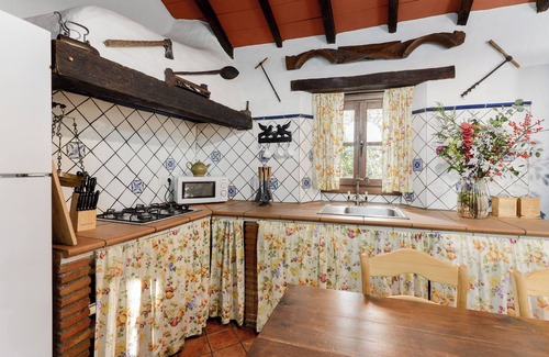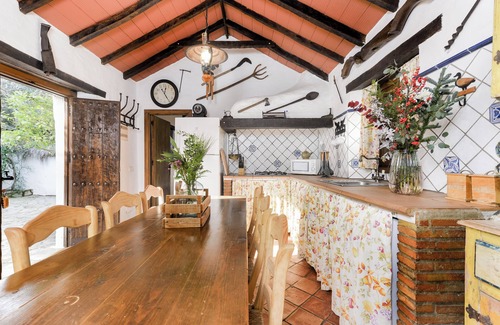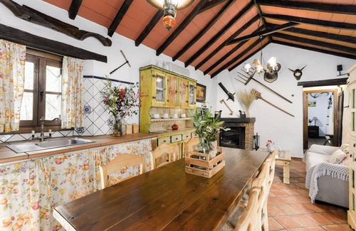 The vacation home "Cortijo Rural Las Aves" occupies a part of a traditional farmhouse in Jimena de la Frontera and is perfect for an unforgettable stay. The 300 m² property consists of a living room, a well-equipped kitchen, 3 bedrooms, and 2 spacious bathrooms, and can accommodate 8 people. On-site amenities include a dedicated workspace for home office, a TV, air conditioning, and a washing machine. A baby cot is also available.