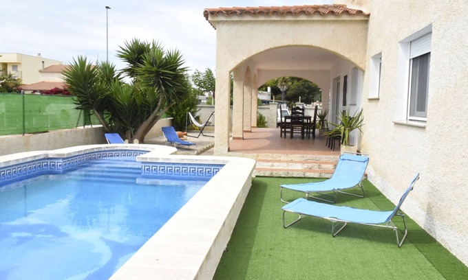 Dani 1 km from Delta del Ebre: Cosy, comfortable house "Dani". In a quiet, sunny position, 100 m from the sea, 100 m from the beach. Private: property (fenced), swimming pool angular (7 x 3 m, depth 1 - depth 80 cm, seasonal availability: 01.Mar. - 31.Oct.) with internal staircase. Outdoor shower. In the house: WiFi, air conditioning. Parking (for 3 cars). Shop 9 km, supermarket 9 km, bus stop 5 km, railway station 25 km, sandy beach "Eucaliptus" 100 m. Golf course (15 hole) 45 km. Nearby attractions: Port Aventura 65 km, Parque natural Ports Tortosa Beseit 52 km, GR 92 15 km, Barcelona 190 km, Parque aquatico 65 km.