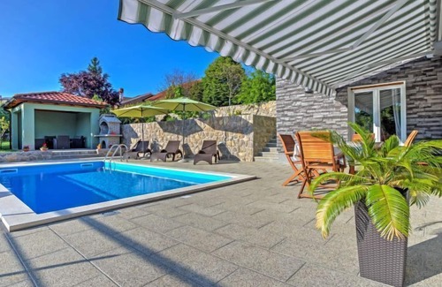 Kastav 7 km from Opatija: Single-family house "Dante", 2 storeys. In the hamlet Marčelji 6 km from the centre of Kastav, 10 km from the centre of Rijeka, 12 km from the centre of Opatija, in a quiet, sunny position, 11 km from the sea, in the countryside. Private: property 1'600 m2 (fenced), swimming pool angular, heated (7 x 3 m, 24 m2, depth 140 cm, seasonal availability: 18.Apr. - 10.Oct.) with salt-electrolysis pool-cleaning system. Outdoor shower, terrace (100 m2), garden furniture, barbecue. In the house: internet access, sauna, washing machine. Parking (for 4 cars) at the house on the premises, single garage. Shop 150 m, restaurant 1.7 km, bus stop 300 m, pebble beach 11 km.