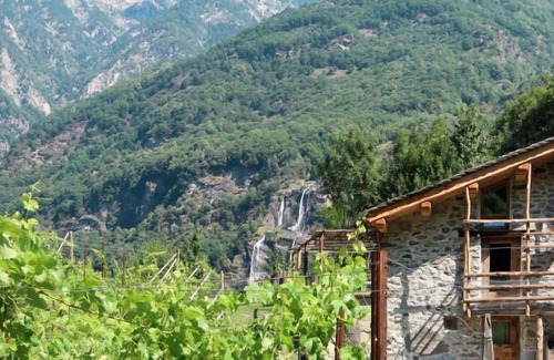 Val Bregaglia: Agriturismo 430 m a.s.l 2 storeys, semi-detached, renovated, surrounded by trees, meadows and vineyards. 3 apartments in the property. In the hamlet Borgonuovo, 400 m from the centre, 4 km from the centre of Chiavenna, 23 km from the centre of Madesimo, in a quiet, sunny position, 23 km from the skiing area, directly by the stream, south facing position. For shared use: park, garden (not fenced) with lawn and plants, meadow, orchard. Garden furniture, barbecue house. Bumpy motor access (50 m via unmade road). Parking at the house. Supermarket 4 km, restaurant, bar 400 m, railway station "Chiavenna" 4 km, sandy beach "La Punta (Sorico, Lago di Como)" 30 km. Walking paths from the house, cycle lane 100 m. Nearby attractions: Cascate dell' Acquafraggia 400 m. Well-known ski regions can easily be reached: Madesimo 23 km. Well-known lakes can easily be reached: Lago di Mezzola 19 km, Lago di Como 30 km. Hiking paths: Sentiero Storico di Fondovalle, Traversata dei Monti, Sentiero Panoramico di Bregaglia. Please note: animals in the neighbourhood. All houses/apartments are individually designed/furnished.