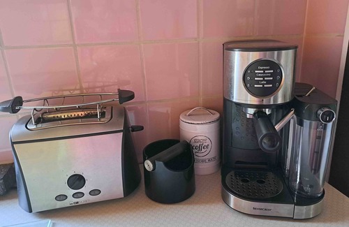Electric hotplates, small table oven, toaster, refrigerator, coffee machine, kettle, small. Dining area, pots, dishes, glasses and cutlery, as well as a small selection of cooking utensils and spices.