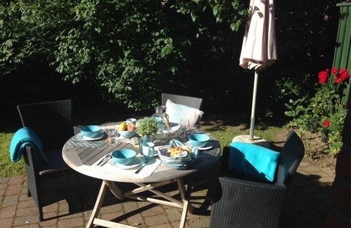 The sheltered south-west terrace is equipped with beautiful garden furniture, and there are two comfortable garden loungers available. There are two modern shower rooms with toilet, in the upper bathroom there is a washing machine. The two bedrooms are furnished with great attention to detail, one room with double bed and TV, the other has two comfortable single beds, one with an additional pull-out bed. This results in 5 real beds. Further facilities include hair dryer, iron / board clothes horse, dog bowls, cleaning equipment including a selection of basic cleaning products, as well as high chair and cot if required. Parking is in front of the house, for bicycles is a lockable shed available. If you arrive by train, we offer a free transfer from the ferry to your holiday home. The village Oldsum is characterized by the many typical thatched thatched houses and is one of the most original villages on Föhr. So if you love peace and enjoy nature, then you are in the right place. A historical walk invites you to explore this beautiful area. For example, beaches in Utersum are easy to reach by bike, there is also a very nice dog beach. On site you will find a food market, as well as some small studios and galleries. The culinary highlights in the village are our two cafés "Im Apfelgarten" and "Stelly's Hüüs", a visit is well worth it!