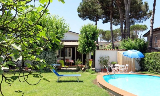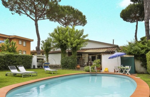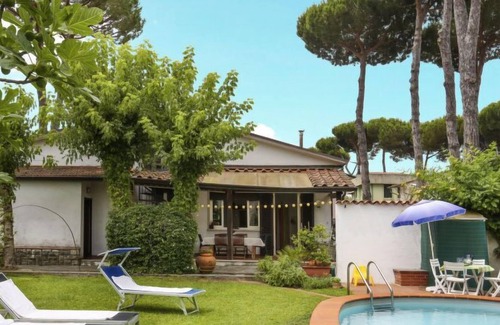 House "Il Mandarino". In the centre 500 m from the centre of Torre del Lago, 7 km from the centre of Viareggio, 20 km from the centre of Pisa, 2 km from the sea. Private: garden 800 m2 (fenced) with trees, natural garden, meadow, swimming pool (8 x 4 m, depth 120 cm, seasonal availability: 02.May. - 03.Oct.). Shower/WC in the pool area, terrace, garden furniture, barbecue, parking (for 2 cars) on the premises, public parking on the road. Supermarket 200 m, sandy beach 2 km. Please note: 1st floor is closed and not occupied.