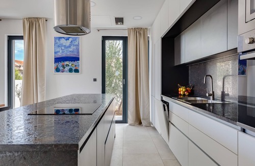 Modern, beautiful villa "Inizio". In a sunny position, 250 m from the sea, 250 m from the beach. Private: property 700 m2, swimming pool angular (7 x 3 m, 27 m2, depth 150 cm, seasonal availability: 15.May. - 15.Oct.) with internal staircase. Outdoor shower, barbecue. In the house: internet access, washing machine. Motor access to the house (50 m via unmade road). Parking (for 3 cars) at the house on the premises. Shop 250 m, restaurant 260 m, bus stop 550 m, pebble beach 250 m, public bathing area 900 m. Marina 4 km. Nearby attractions: Aquapark 2 km, NP Krka 17 km.