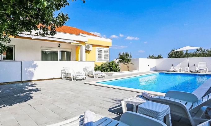 Single-family house "Karlo". 7 km from the centre of Posedarje, in a quiet, sunny position, 2 km from the sea, 2.2 km from the beach. Private: property 1'200 m2, swimming pool (8 x 4 m, depth 150 cm, seasonal availability: 01.May. - 01.Oct.). Outdoor shower, table tennis, garden furniture, barbecue. In the house: internet access, trampoline, washing machine. Parking (for 3 cars) at the house on the premises. Shop 750 m, supermarket 6 km, restaurant 4.5 km, bus stop 6.1 km, sandy beach 4 km. Nearby attractions: Np Paklenica 30 km, Np Krka 80 km.