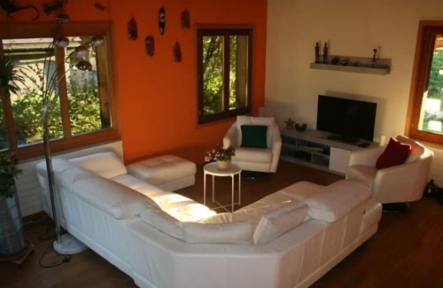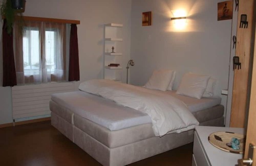 "Le Loft", 4-room house 220 m2. Comfortable and tasteful furnishings: large living/dining room with Scandinavian wood stove and satellite TV (flat screen). Exit to the garden, to the terrace. Large, 1 room with 1 double bed (220 cm, length 200 cm). 1 room with 1 double bed (160 cm, length 200 cm). 1 room with 1 double bed (160 cm, length 200 cm). Open kitchen (oven, dishwasher, 4 ceramic glass hob hotplates, toaster, kettle, microwave, electric coffee machine, steamer, raclette grill, cooking island, fondue Set (chinoise, cheese)). Bath/shower/WC. Large terrace, garden. Terrace furniture, barbecue, covered balcony. Facilities: iron. Internet (WiFi, free). Reserved parking (roofed, 2 cars) at the house. Electric vehicle charging station. Please note: non-smokers only.