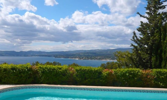6-room villa 150 m2. Practical and beautiful furnishings: living/dining room with TV (flat screen), hi-fi system, DVD and air conditioning. Exit to the terrace. Kitchen (oven, dishwasher, 3 induction hot plates, microwave, freezer, electric coffee machine) with dining nook and TV. Exit to the terrace. Shower, sep. WC. On the lower ground floor: small living/dining room with TV and air conditioning. Exit to the swimming pool. Entrance hall with 1 double sofabed (130 cm, length 190 cm). 1 room with 1 french bed (140 cm, length 190 cm). Exit to the swimming pool. Kitchenette (2 induction hot plates, combination microwave). Shower/WC. Upper floor: 1 room with 1 french bed (160 cm, length 200 cm). Exit to the balcony. 1 room with 1 x 2 bunk beds (90 cm, length 190 cm). 1 room with 1 french bed (140 cm, length 190 cm). Bathroom, sep. WC, double hand-basin. Electric heating, air-conditioning, forced-air heating. Balcony 10 m2, terrace 30 m2, roofed, north-west facing position. Terrace furniture, barbecue. Marvellous panoramic view of the sea and the countryside. Facilities: washing machine, iron. Internet (WiFi, free). Reserved parking (fenced 2 cars). Please note: TV only FR. Smoke alarm. 83112000235