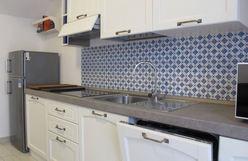 "Malva", 3-room terraced house 58 m2 on 2 levels. Bright, comfortable furnishings: living/dining room with satellite TV and air conditioning. Exit to the garden, to the terrace. Open kitchen (dishwasher, 4 induction hot plates, toaster, kettle, microwave, freezer). Shower/bidet/WC. Upper floor: 1 double bedroom with air conditioning. Exit to the balcony. 1 room with 2 beds. Electric heating. Balcony 10 m2, terrace 19 m2, roofed, garden 42 m2. Terrace furniture. Facilities: washing machine, iron, mosquito net, baby cot for up to 2 year olds. Internet (WiFi, free). Parking (fenced 1 car) at the house, width 230 cm. Please note: suitable for families. Non-smoking house, parking space for small car only. Private entrance. IT038006B4KCD3WF7D