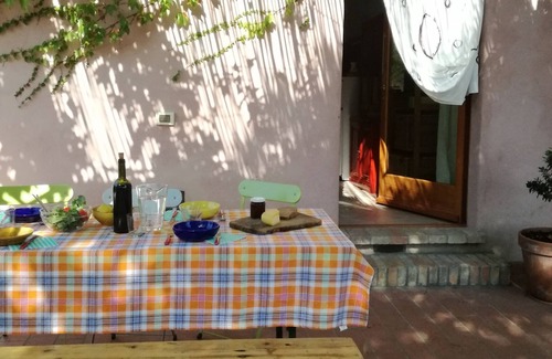 This independent apartment has a kitchen, bathroom, two bedrooms and a mezzanine, arranged on two levels. It is part of a country farmhouse in which we live with our children. The house is surrounded by a large private garden, where there is a table with chairs, deck chairs and some games for children as well as a parking area. From the porch and from the windows you can admire the changing colors of the Marche hills and the sky above them. The air here is clean, you can listen to the sounds of nature, fall asleep to the singing of crickets and wake up with the chirping of birds. We are located 30 km from the sea, in the hinterland of Fano not far from Urbino. Ideal starting point for splendid walks or bicycle rides to discover small villages and ancient landscapes. You will enjoy the peace and nature that surround us and the products of our organic and biodynamic farm. You can book lunch or dinner served at the table with us, we offer you an entirely organic meal whose main ingredients are grown by Antonio, the menu is simple and homemade, made with seasonal products, including wine and coffee or herbal tea.