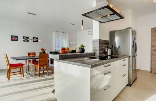 Pobri: Single-family house "Races", 3 storeys, built in 2017. Above Opatija 2.5 km from the centre of Opatija, in a quiet, sunny position, 2.5 km from the sea, 2.5 km from the beach, in a cul-de-sac. Private: property 1'000 m2 (fenced), lawn 200 m2, swimming pool angular (7 x 4 m, 30 m2, depth 140 cm, seasonal availability: 01.May. - 15.Oct.). Outdoor shower, hot tub, terrace (12 m2), garden furniture, barbecue. In the house: internet access, billiard table, table football, washing machine. Parking (for 5 cars) at the house on the premises. Shop 150 m, restaurant 2.5 km, bus stop 63 m, pebble beach 2.5 km, public bathing area 2.5 km, concrete beach 2.5 km. Youth groups are not allowed. Organizing a party is not allowed.Hot tub heating extra in the period 15.10.-01.05., in other periods included in the price. The unit consists of 2 houses rented as one unit. Private: terrace 12 m2, outdoor kitchen (4 hot plates, fridge), swimming pool (35 m2, depth 140 cm, 01.05.-15.10.). Unconventional pool shape.