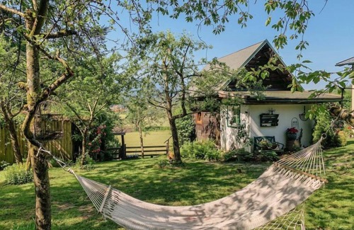 2-room house 48 m2 on 2 levels. Stylish and romantic furnishings: living/dining room with dining nook, hi-fi system and electric heater. Exit to the terrace. Small kitchenette (2 ceramic glass hob hotplates, electric coffee machine). Bath/WC. Upper floor: (steep stair), 1 room with sloping ceilings, ceiling height 100 - 330 cm with 1 french bed (140 cm, length 200 cm), satellite TV. Beautiful view of the countryside. Facilities: Internet (WiFi, free). Please note: not suitable for small children. Non-smoking house. Maximum 1 pet/ dog allowed. Smoke alarm, fire extinguisher. The bedroom is reached via a steep wooden staircase, which is secured in the room with a grated door.