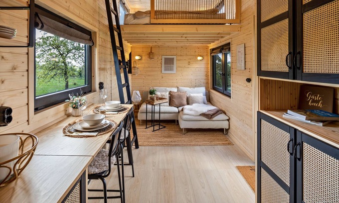 The vacation home "Tiny House No1" in Ulrichstein creates a unique and memorable setting for your getaway. This loft-style 2-storey property consists of a living room with a sofa bed for one person, a kitchen, 1 bedroom, and 1 bathroom, and can accommodate 5 people. On-site amenities include high-speed Wi-Fi (suitable for video calls), a smart TV with streaming services, and air conditioning.