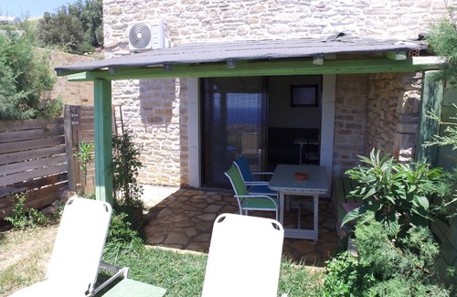 The two-storey stone house Despoina-Triopetra stands on its own with its own enclosed front garden and is simply and originally furnished. All the best conditions for an unclouded beach holiday, close to the sea and nature. A small kitchen garden, colourful flowers and some lawn in front of the holiday home and the terrace complete the picture of the house, which was only newly built in February 2021.