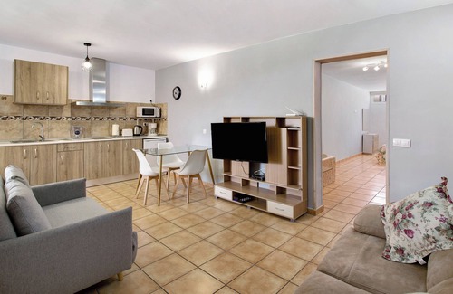 Located in Moya, the holiday apartment "Montemar 2" is part of a holiday complex consisting of 2 apartments, Montemar 1 and Montemar 2, which are rented separately with a maximum capacity of 3 people in each apartment. This property offers guests beautiful views of the sea and mountains. The private area of 50 m² consists of a living room with a sofa bed for one person, a well-equipped kitchen, 1 bedroom with a double bed, and 1 full bathroom. Additional amenities include high-speed Wi-Fi (suitable for video calls) with a dedicated workspace for making video calls, a fan, a washing machine, and a smart TV. A crib can be provided upon request. The holiday apartment has a private outdoor area with terrace furniture. There is also a shared area with guests of the other apartment, consisting of a swimming pool, jacuzzi, solarium, outdoor shower, barbecue, and a large garden with fruit trees and a small seasonal vegetable garden. The property has private parking suitable for cars, motorcycles, and bicycles. Pets are allowed for an additional fee payable directly to the host. Pets are present in the vicinity of the property: it is important to note that there are two cats that occasionally roam the property and a dog that is in a fenced area separate from the apartments. This property does not have air conditioning. Parties, smoking indoors, and having guests are not allowed. An electric vehicle charging station is available. Beach/pool towels are provided. The electricity in this property is generated by solar energy. This property has recycling rules; more information is provided on-site.