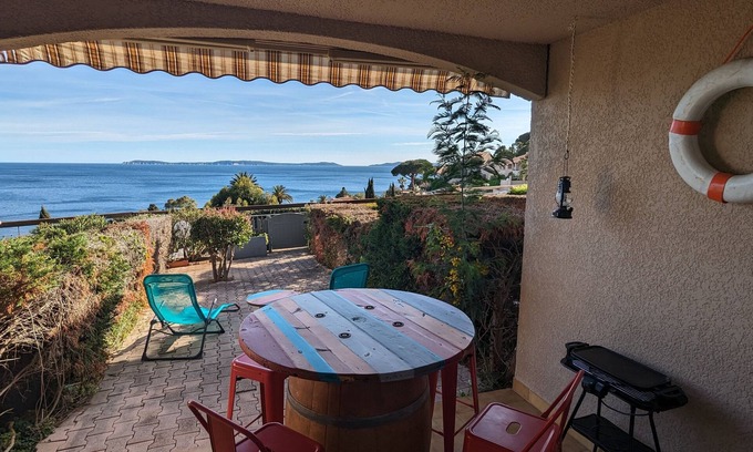 Charming T2 renovated, 400 meters from the beach. panoramic sea view facing the islands of Port Cros and Levant with private garden in a quiet, secure residence with swimming pool.