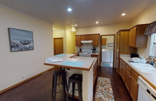 The kitchen has all the amenities of home. Whether you’re preparing a quick breakfast or a gourmet dinner, the fully equipped kitchen has everything you need to create delicious meals. The spacious countertops offer plenty of room to prepare meals, and the modern appliances, including a refrigerator, stove, microwave, and dishwasher, make cooking and cleaning up a breeze. There’s also a large dining table that can comfortably seat everyone in your group, making it the perfect place for family meals or game nights.