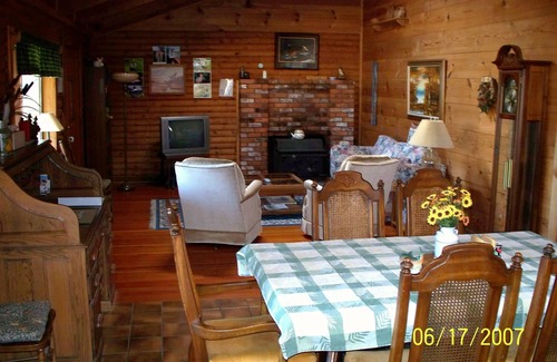 The Cabin is a two bedroom 1 bath Log Home on 10 manicured acres with a 2.5 acre fishing lake. The Cabin has a fully stock kitchen and laundry room and sleeps 5 cumfortably The 1200 square foot interior is surrounded by a covered deck and seating area. The lake is stocked with Bass, Blue Gill and Catfish. Fishing is permitted on a catch and release basis. A covered dock at the pond is electrified, hot and cold running water, refrigerator, lighting, dinning table for 6 and barbecue.
