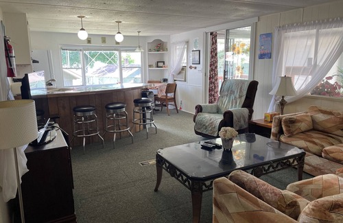 This contemporary mobile home is larger than typical cottages, featuring two bedrooms, one full bath, a kitchen bar, a fully furnished sunroom, a deck, gas heating, and air conditioning. Sleeping accommodations include a queen-sized bed, full and twin-sized bunk beds, a sleeper sofa, and a single rollaway bed.