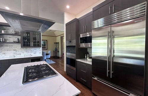 Newly renovated and fully stocked modern chef's kitchen with Wolf and Sub-Zero appliances and casual dining area that seats up to ten. Formal dining room also seats up to twelve people.