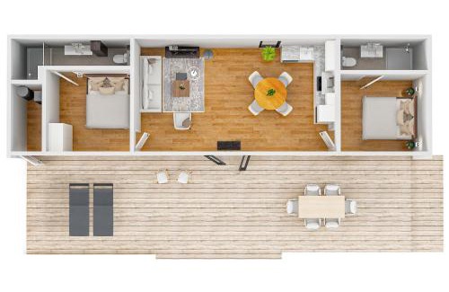 - Stylish 4+1-person lodge with a terrace extending over the lake, luxury kitchen, walk-in shower and air conditioning.