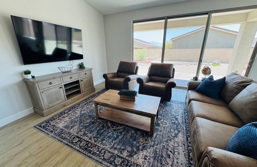 The fully equipped kitchen boasts stainless steel appliances, generous counter space, and everything you need to enjoy home-cooked meals. After a day out, unwind in the inviting living room with cozy seating and a large TV, or take in the fresh desert air from your patio.