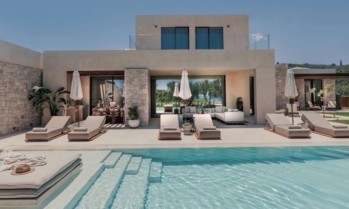 Experience luxury at Valerozo Maestosa Villa in Zakynthos, comprising a 200 sqm main villa and a cozy 40 sqm semi-detached unit, perfect for families or groups.