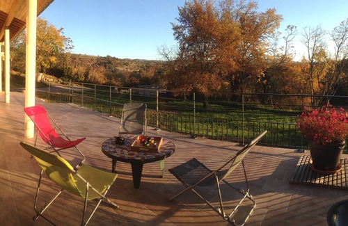 Contemporary and independent villa with local stones on a plot of 1300m2, classified 3 ears, 6 people 10 'from the river. Excellent sun exposure guaranteed from sunrise to sunset.